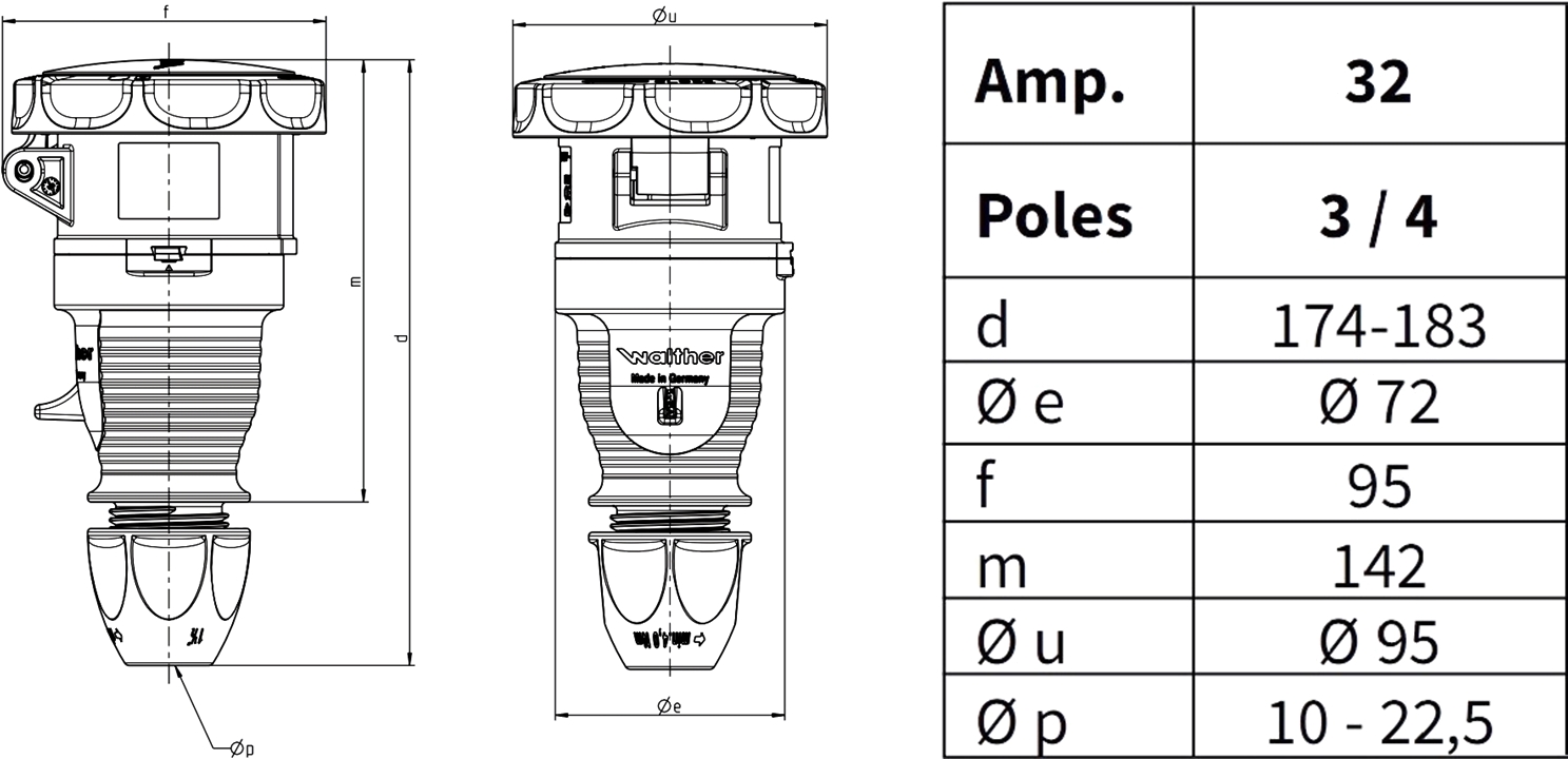 מחבר חשמל תעשייתי כחול - נקבה לחיבור לכבל - 2P+E , 230VAC , 32A WALTHER ועוד קונקטורים, מחברים ומתאמים. לחצו למיפרט טכני מלא. צרו קשר לייעוץ מקצועי: 04-8520233