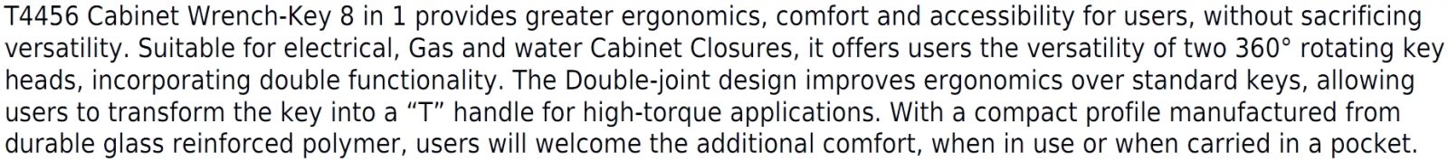 | 0817153 מפתח אוניברסלי לארונות שירות - CK TOOLS T4456 | CK TOOLS | מפתח אוניברסלי לארונות שירות - CK TOOLS T4456 ♦ עבור פתיחת ארונות חשמל, גז, מים וכדומה♦ פלדת CAST... כלי עבודה ידניים » מפתחות ובוקסות | כמות |