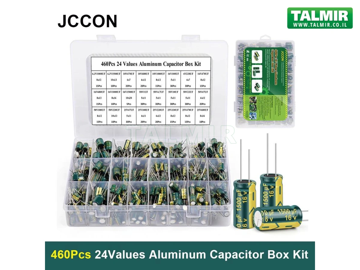 קיט קבלים אלקטרוליטיים 460 יחידות JCCON ועוד רכיבי אלקטרוניקה. לחצו למיפרט טכני מלא. צרו קשר לייעוץ מקצועי: 04-8520233