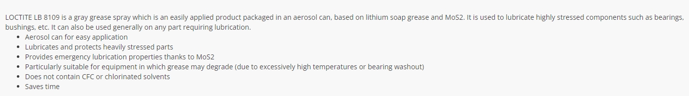ספריי גריז - LOCTITE 8109 LOCTITE ועוד דבקים , תרסיסים וכימיקלים. לחצו למיפרט טכני מלא. צרו קשר לייעוץ מקצועי: 04-8520233