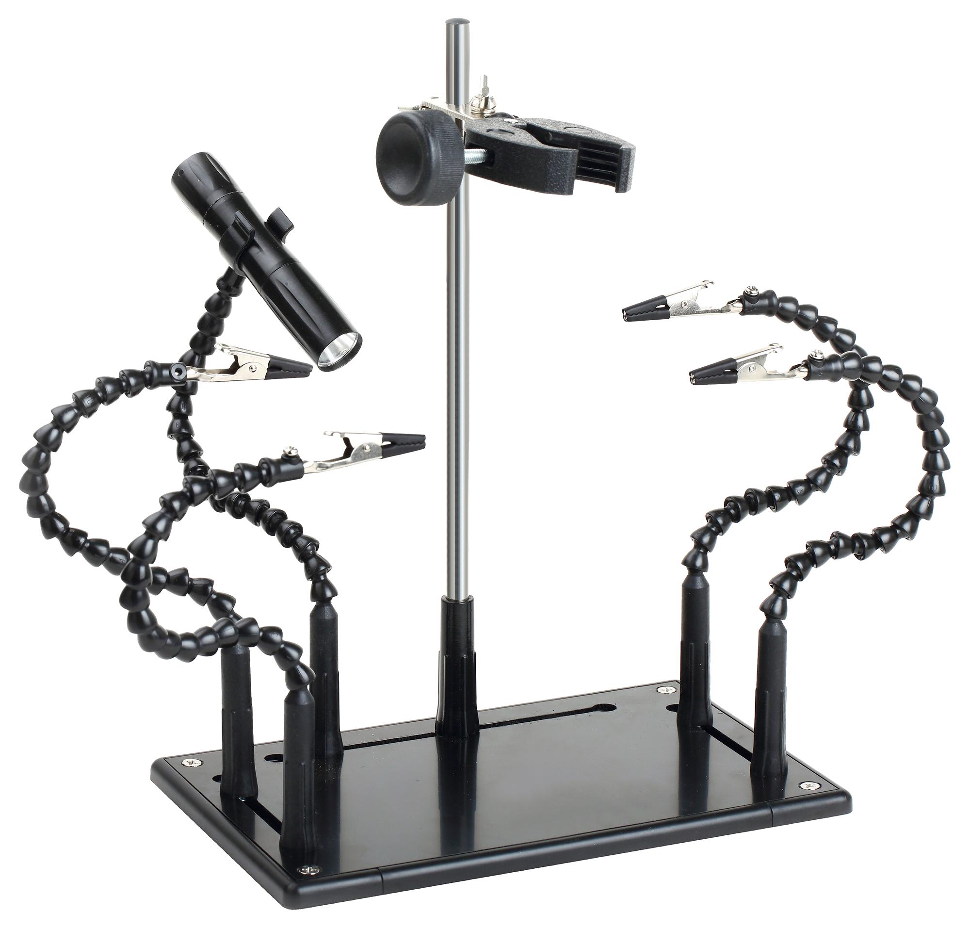 זרועות: 5 זרועות מתכווננות עם קליפסים ("תנינים") בקצה – מאפשרות אחיזה של רכיבים מכיוונים שונים בו-זמנית