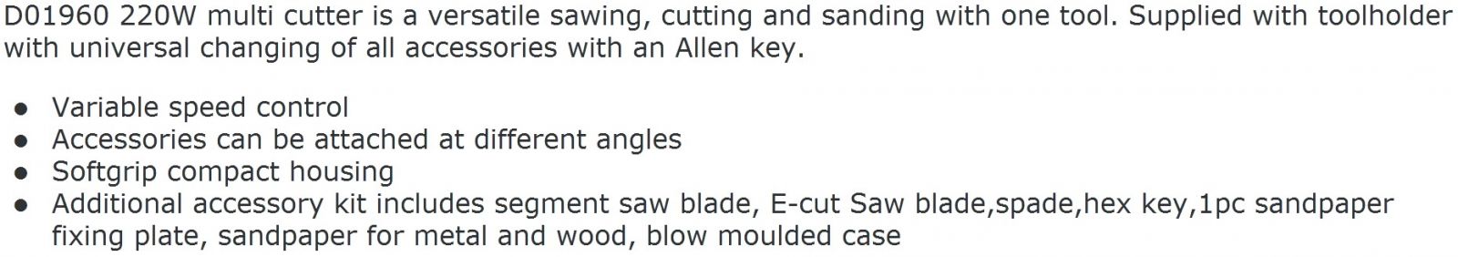 | 7323012 מולטיטול חשמלי 220V (קיט) | DURATOOL | מולטיטול חשמלי 220V (קיט) ♦ הספק : 220W♦ ידית אחיזה רכה ונוחה♦ ... כלי עבודה נטענים / חשמליים » מסורים וכלי חיתוך חשמליים | כמות |