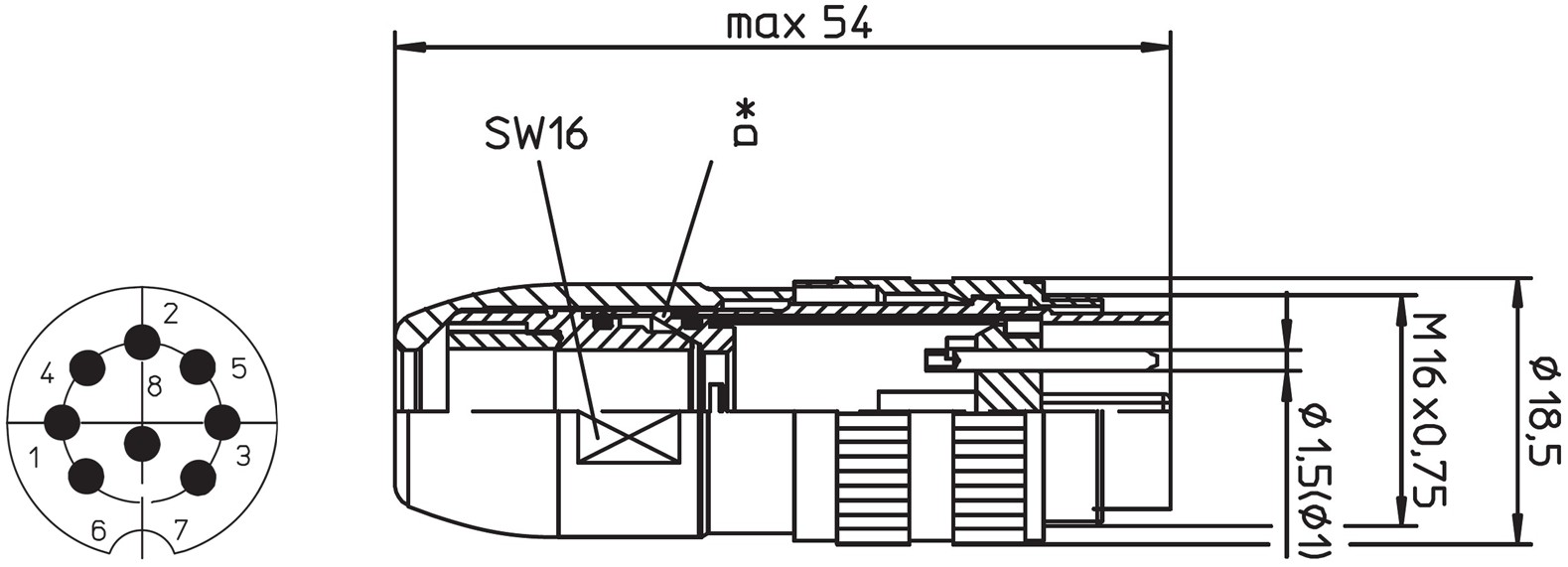 מחבר תעשייתי DIN 0332 - זכר להלחמה לכבל - 8 מגעים