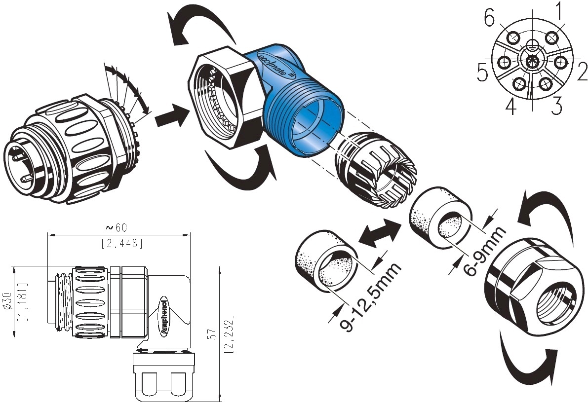 מחבר תעשייתי C016 - זכר זוויתי להלחמה לכבל - 6 מגעים + הארקה
