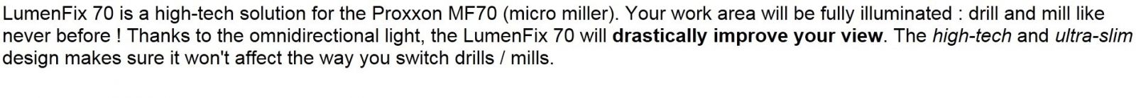 | LUMENFIX70 תאורת לדים לכרסומת - PROXXON MF 70 | PROXXON | תאורת לדים לכרסומת - PROXXON MF 70 ♦ התאורה מופעלת על ידי סוללת 9V (כלולה בערכה) ... כלי עבודה נטענים / חשמליים » כרסומות ומחרטות שולחניות | כמות |