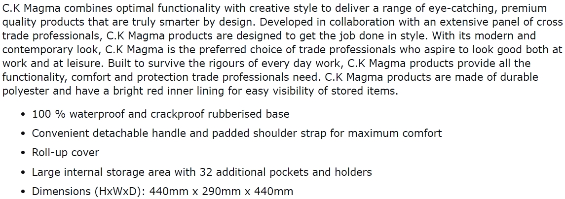 | 05133GS תיק נשיאה לכלי עבודה - CK MAGMA MA2634 - 490X440X290MM | CK MAGMA | תיק נשיאה לכלי עבודה - CK MAGMA MA2634 - 490X440X290MM ♦ עשוי מבד פוליאסטר חזק ועמיד♦ ת... ארגזי כלים ופתרונות אחסון » ארגזי כלים , מזוודות טכנאים ותיקים לכלי עבודה | כמות |