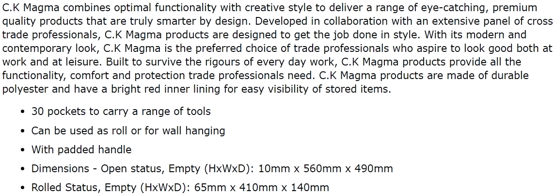 | 3755881 תיק נשיאה רול-אפ לכלי עבודה - CK MAGMA MA2718 - 560X490X10MM | CK MAGMA | תיק נשיאה רול-אפ לכלי עבודה - CK MAGMA MA2718 - 560X490X10MM ♦ עשוי מבד פוליאסטר חזק ועמיד... ארגזי כלים ופתרונות אחסון » ארגזי כלים , מזוודות טכנאים ותיקים לכלי עבודה | כמות |