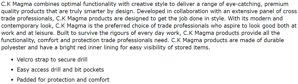 | 55133GS נרתיק למברגה / מקדחה עבור חגורת כלי עבודה - CK MAGMA MA2720 | CK MAGMA | נרתיק למברגה / מקדחה עבור חגורת כלי עבודה - CK MAGMA MA2720 ♦ עשוי מבד פוליאסטר חזק ועמיד♦&n... ארגזי כלים ופתרונות אחסון » ארגזי כלים , מזוודות טכנאים ותיקים לכלי עבודה | כמות |