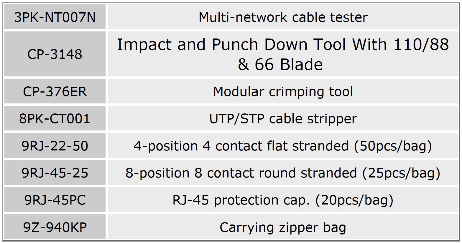 | 0142251 קיט כלי עבודה מקצועי לטכנאי תקשורת PROSKIT 1PK-940 CAT5E / CAT6 | PROSKIT | קיט כלי עבודה מקצועי לטכנאי תקשורת PROSKIT 1PK-940 CAT5E / CAT6 למפרט מלא לחץ כאן... כלי עבודה ידניים » קיטים - כלי עבודה ידניים | לא ניתן להזמין - אזל המלאי |
