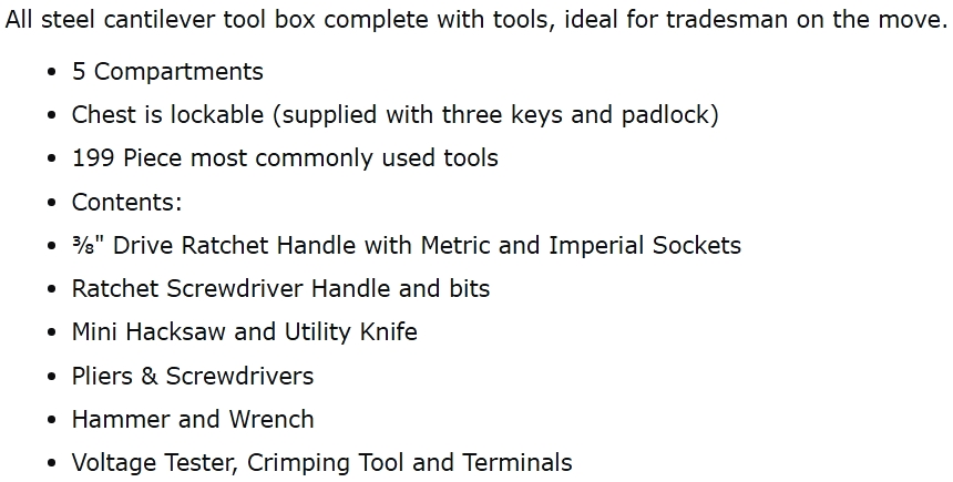| 1918702 קיט כלי עבודה מקצועי - 199 חלקים - CLARKE CHT641 | CLARKE | קיט כלי עבודה מקצועי - 199 חלקים - CLARKE CHT641 ♦ ארגז כלים מפלדה - מדורג מק''ט 0275981♦&nb... כלי עבודה ידניים » קיטים - כלי עבודה ידניים | לא ניתן להזמין - אזל המלאי |