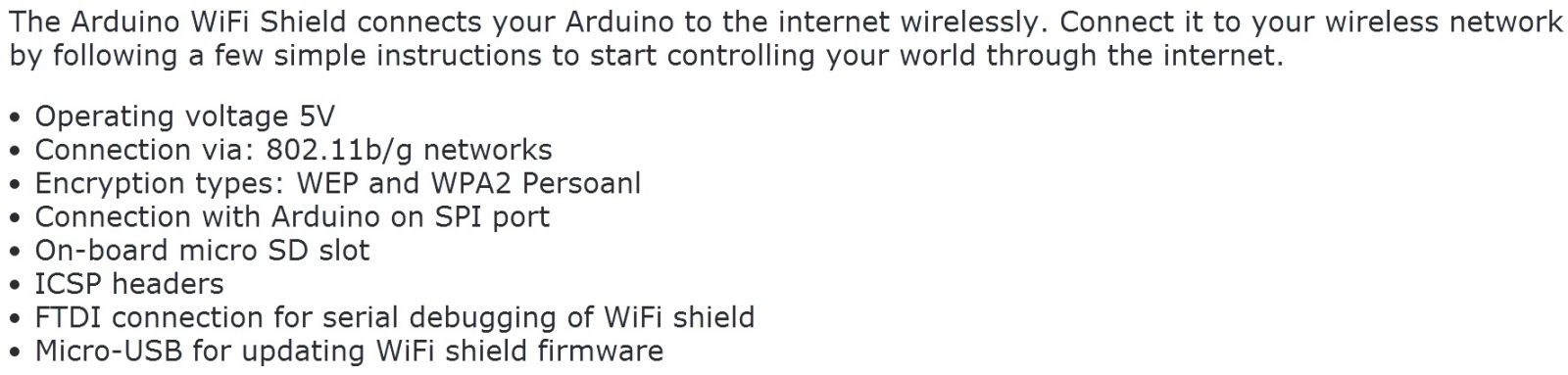 | 5872122 כרטיס הרחבה - ARDUINO WIFI SHIELD | ARDUINO | כרטיס הרחבה - ARDUINO WIFI SHIELD כל כרטיסי ה ARDUINO בטלמיר הינם תוצרת איטליהקיימים תוצרת סין עם רכיבים ברמה... מוצרי פיתוח לאלקטרוניקה » מוצרי פיתוח לאלקטרוניקה - ARDUINO | לא ניתן להזמין - אזל המלאי |