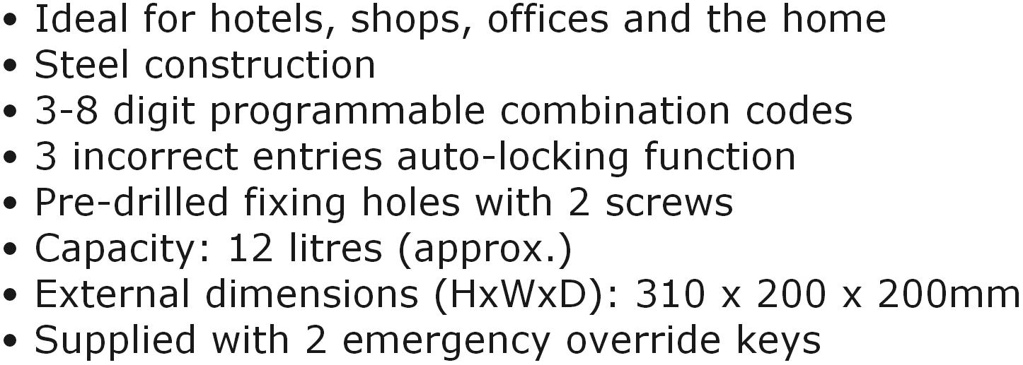 | 8431431 כספת אלקטרונית 12 ליטר | DEFENDER SECURITY | כספת אלקטרונית 12 ליטר ♦ מבנה פלדה חזק ועמיד♦ קוד 3-8 מספרים ניתן לתכנות&... פתרונות אבטחה » מנעולים וכספות | כמות |