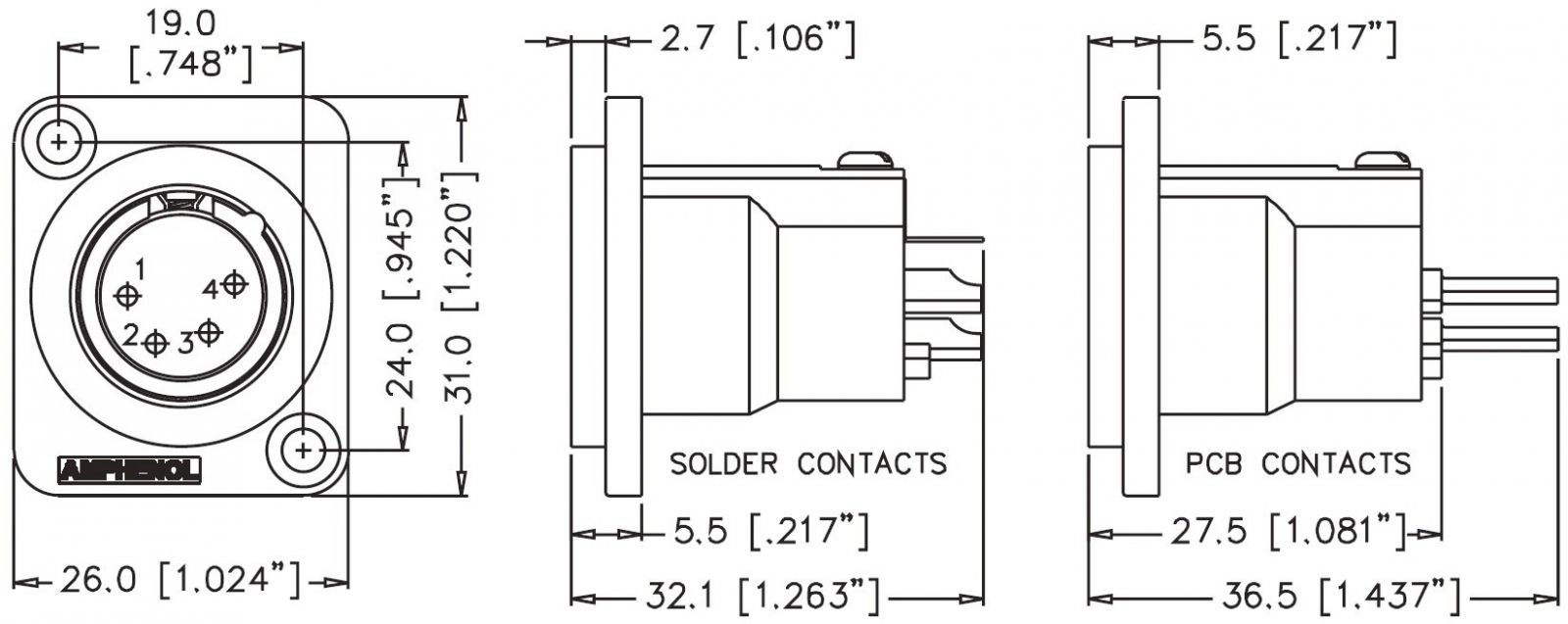 מחבר XLR זכר להלחמה לפנל - 4 מגעים - AMPHENOL AC4MDZ