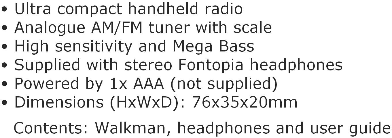 | 4112932 רדיו אוזניות נייד אנלוגי - SONY SRF-S84 | SONY | רדיו אוזניות נייד אנלוגי - SONY SRF-S84 ♦ קטן מימדים וקל משקל♦ טיונר אנלוגי AM... Talmir Home Tech » מערכות שמע ותחנות עגינה | לא ניתן להזמין - אזל המלאי |