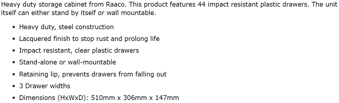 | 1907631 ארונית 44 מגירות לאחסון רכיבים - 510X306X147MM | RAACO | ארונית 44 מגירות לאחסון רכיבים - 510X306X147MM ♦ מטעפת פלדה קשיחה וחזקה♦ אפשרות תליה על הקיר... ארגזי כלים ופתרונות אחסון » פתרונות אחסון ושינוע לרכיבים וכלי עבודה | כמות |
